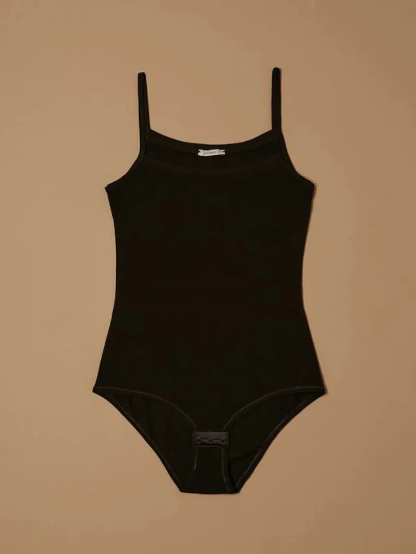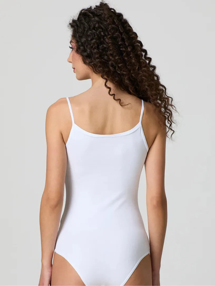 Body top con spalline sottili e chiusura a gancetti. Realizzato in cotone elastico, con scollatura semi ampia, perfetta per risaltare le forme. Ottima vestibilità e massimo comfort, versatile sia per uso esterno che come sottogiacca.