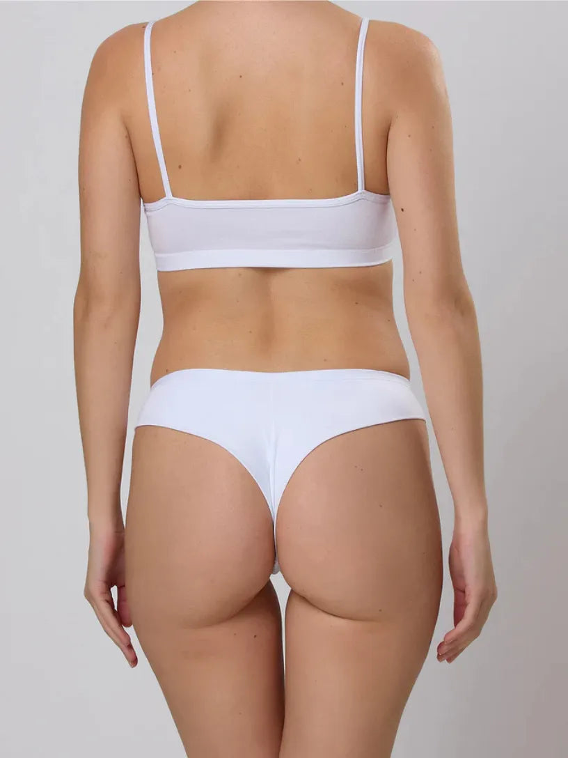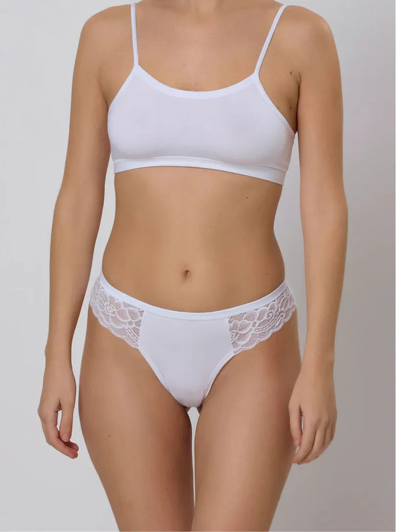 Brasiliana in cotone modal, liscia al tatto ed estremamente piacevole da indossare. Bordo in cotone e morbido pizzo sui fianchi, per un comfort assicurato senza rinunciare a raffinati dettagli. Retro doppiato con cucitura centrale che dona un taglio modellante e sensuale esaltando le curve di ogni donna.