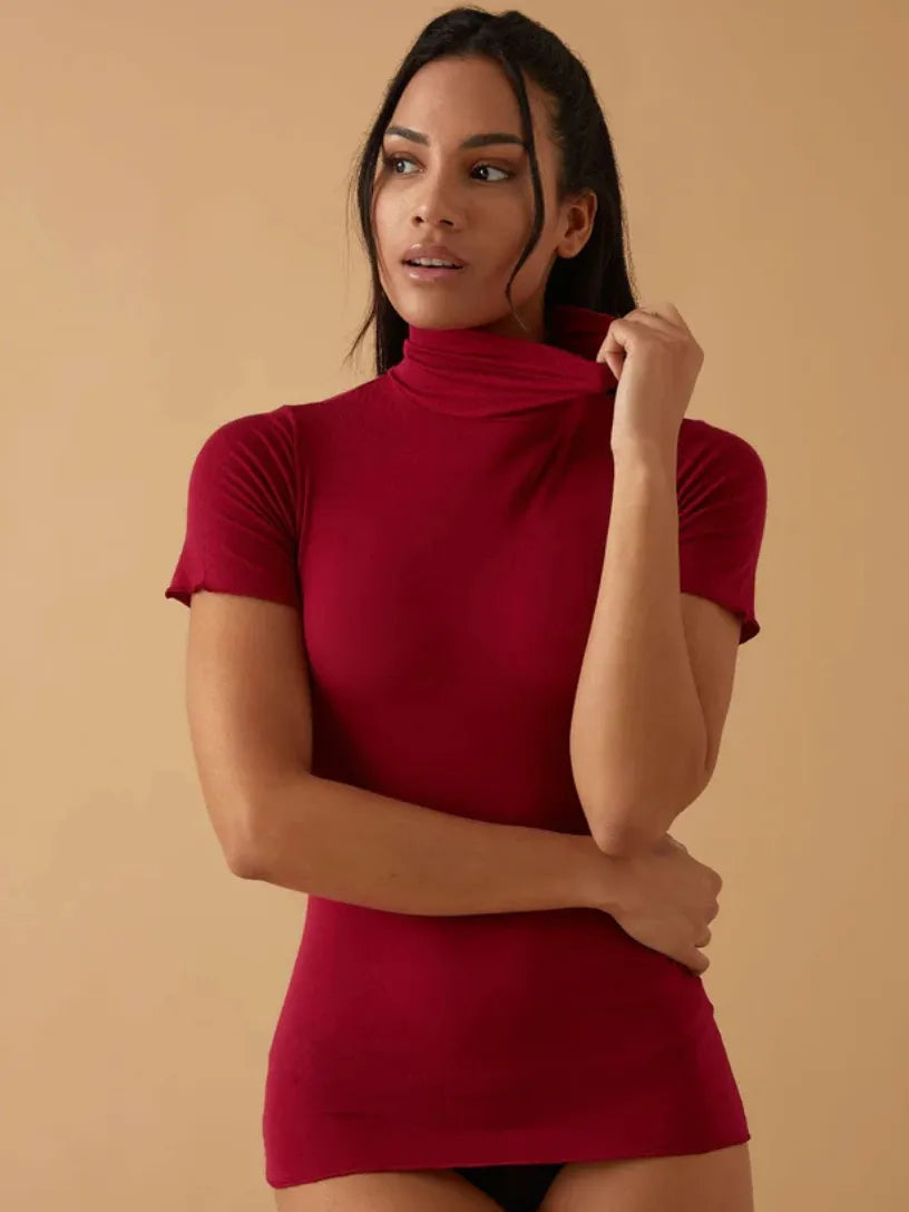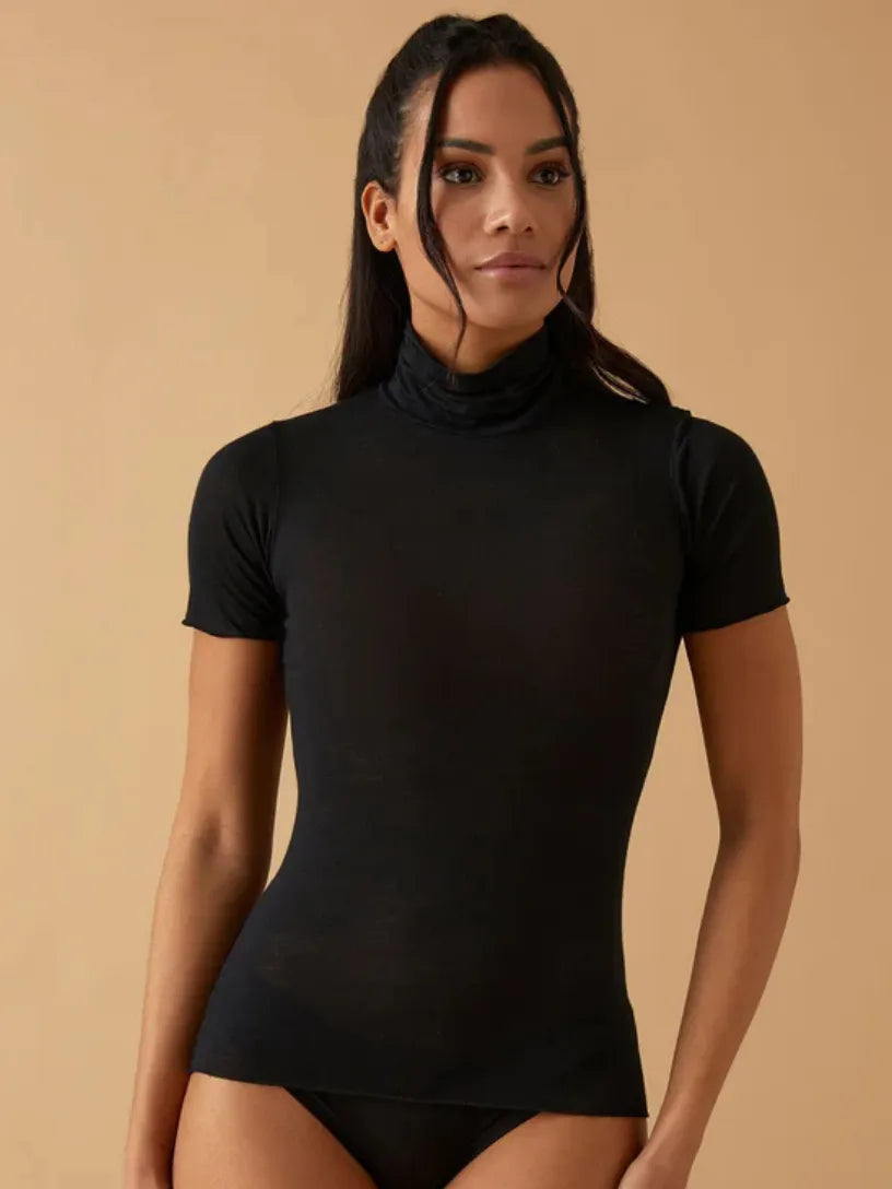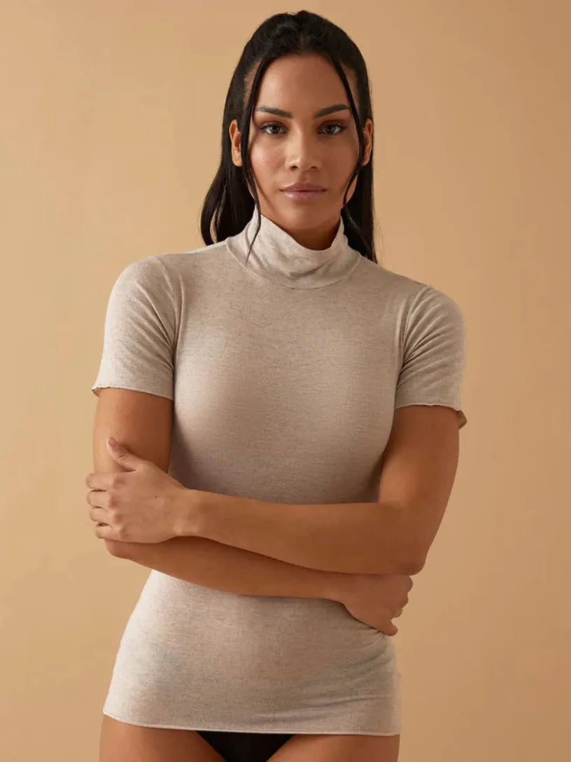Maglia a mezza manica con collo alto, realizzata con morbido Cashmere. Perfetta come sottogiacca, dona un tocco chic e raffinato, restando comunque calda e avvolgente. Tessuto elastico e vellutato che conferisce un piacevole effetto seconda pelle.