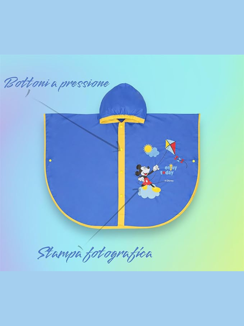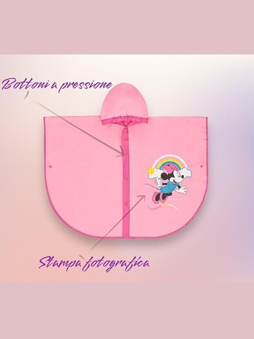 La mantella antipioggia ELLEPI Minnie e Topolino è pensata per proteggere i più piccoli dalla pioggia con stile e comfort. Realizzata in materiale EVA impermeabile, garantisce morbidezza ed elasticità, ideale per bambini da 2 a 6 anni. I materiali sono ipoallergenici, antibatterici e non tossici, assicurando sicurezza e qualità superiore. Facile da indossare grazie ai bottoni a clip e al cappuccio pratico, è una soluzione funzionale e affidabile per mantenere i bambini asciutti in modo semplice e rapido.