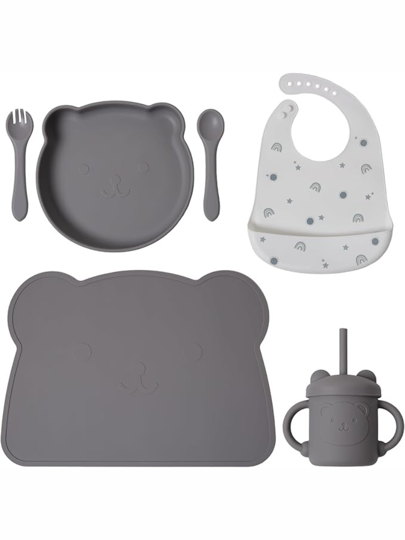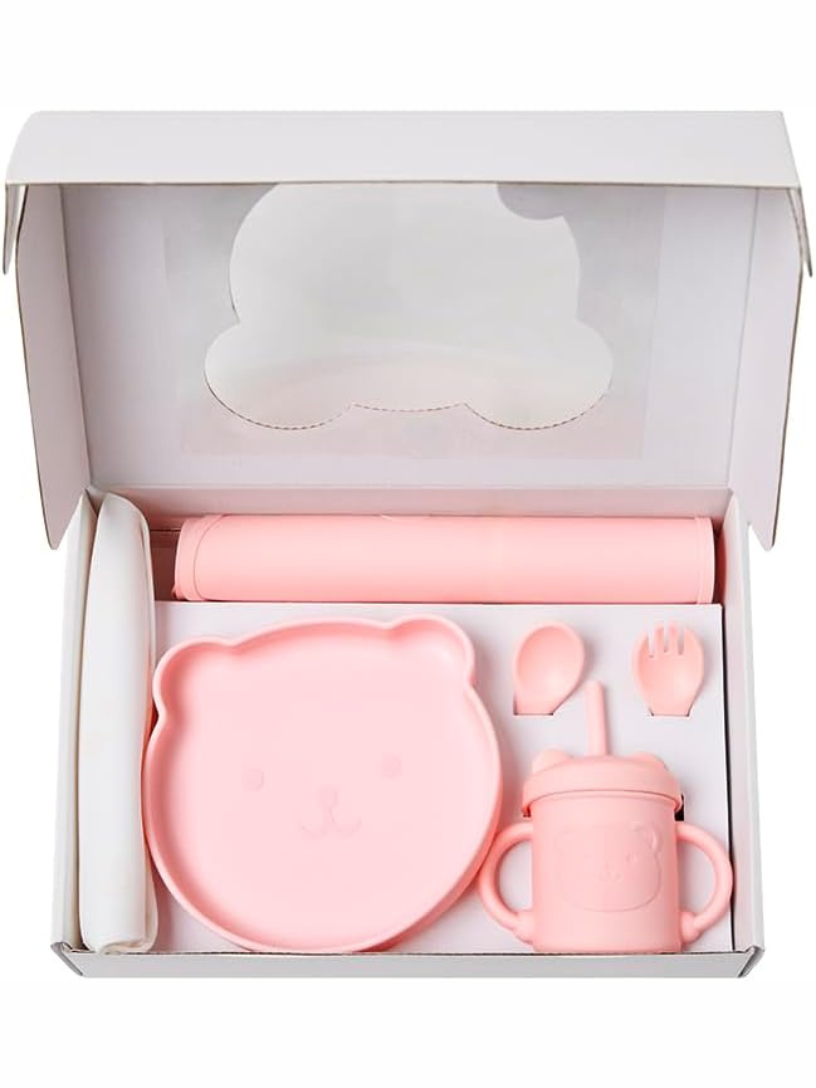 Il set pappa svezzamento neonato ELLEPI è realizzato in silicone sicuro e include tutto il necessario per i primi pasti: piatto con ventosa per stabilità, posate ergonomiche facili da impugnare, bicchiere con cannuccia per facilitare la bevuta, bavaglino con tasca raccogli pappa e tovaglietta antiscivolo. Un kit completo e pratico, ideale per accompagnare il bambino durante lo svezzamento e perfetto come regalo utile e di qualità.