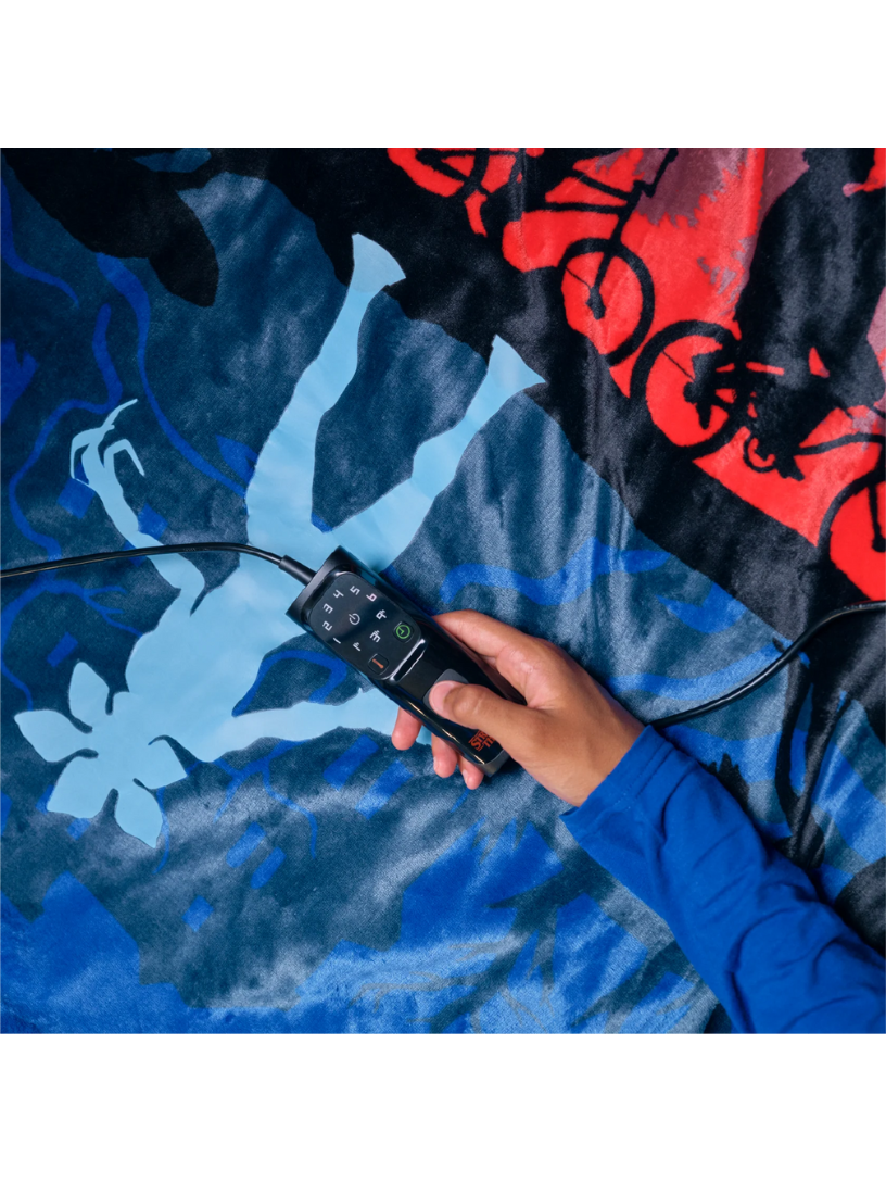 Immergiti nell'atmosfera del Sottosopra con questo plaid riscaldabile esclusivo Stranger Things. Caratterizzato da un design accattivante con il Mind Flayer e le creature del Sottosopra su sfondo rosso e azzurro, presenta un Demogorgone termocromico che cambia colore al calore per un effetto sorprendente. Realizzato in morbido tessuto velvet lavabile, offre comfort superiore durante le tue maratone seriali. La tecnologia Adapto regola automaticamente la temperatura mentre guardi, con 6 livelli selezionabili e autospegnimento programmabile a 1, 3 o 9 ore. Dotato del sistema di sicurezza Electro Block® e progettato per efficienza energetica, è il regalo natalizio ideale per gli appassionati della serie.