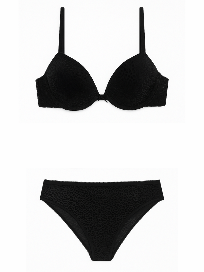 Coordinato intimo sofisticato che unisce comfort e eleganza. Il push-up modellante valorizza il décolleté con un effetto vellutato e velato, mentre i dettagli maculati in velluto aggiungono un tocco di ricercatezza. La slip coordinata completa l'insieme con la stessa raffinatezza. Ideale per chi ricerca lingerie che combina sensualità e qualità costruttiva, perfetta sia sotto gli abiti che come momento di puro piacere personale.