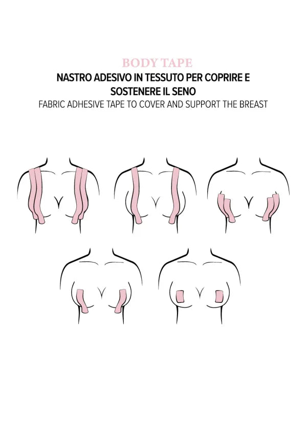 Nastro adesivo in tessuto per coprire e sostenere il seno, da indossare sotto abiti molto scollati davanti o sulla schiena. Cinque metri di nastro riposizionabile.