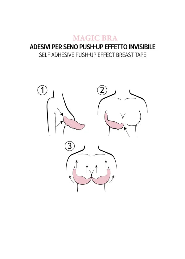 – Applicare l’adesivo partendo dall’esterno del seno, facendolo passare sotto ed infine l’interno dandogli la forma desiderata.
