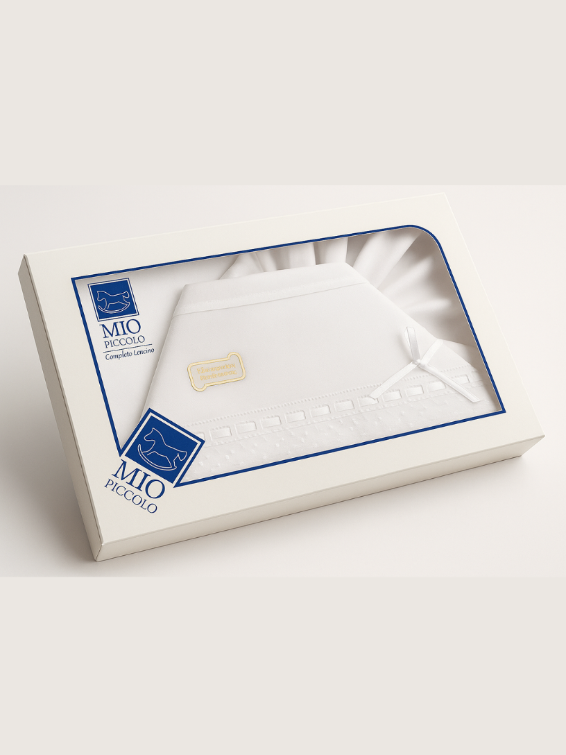 Realizzato in puro cotone 100%, il set lenzuolino culla "MIO PICCOLO" unisce qualità e raffinatezza grazie alle eleganti applicazioni in San Gallo. Progettato su misura per adattarsi perfettamente ai lettini, garantisce comfort e praticità. Ipoallergenico e prodotto interamente in Italia, offre sicurezza e artigianalità superiore. Facile da lavare in lavatrice a basse temperature e adatto all’asciugatrice con ciclo delicato, mantiene la sua bellezza nel tempo. Una scelta ideale per chi cerca un prodotto di alta qualità, curato nei dettagli e rispettoso della pelle delicata del neonato.