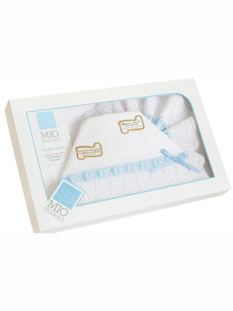 Il set "MIO PICCOLO" include lenzuolino sopra 115 x 165 cm, lenzuolino sotto 68 x 130 cm con 15 cm di bordo e federa 52 x 40 cm, tutti in fondo bianco impreziositi da un delicato pizzo macramè. Realizzato al 100% in cotone, assicura traspirabilità e comfort ottimali per la culla del tuo bambino. La qualità dei materiali e l’eleganza dei dettagli rendono questo set ideale per garantire il massimo benessere e uno stile raffinato nell’ambiente nanna.