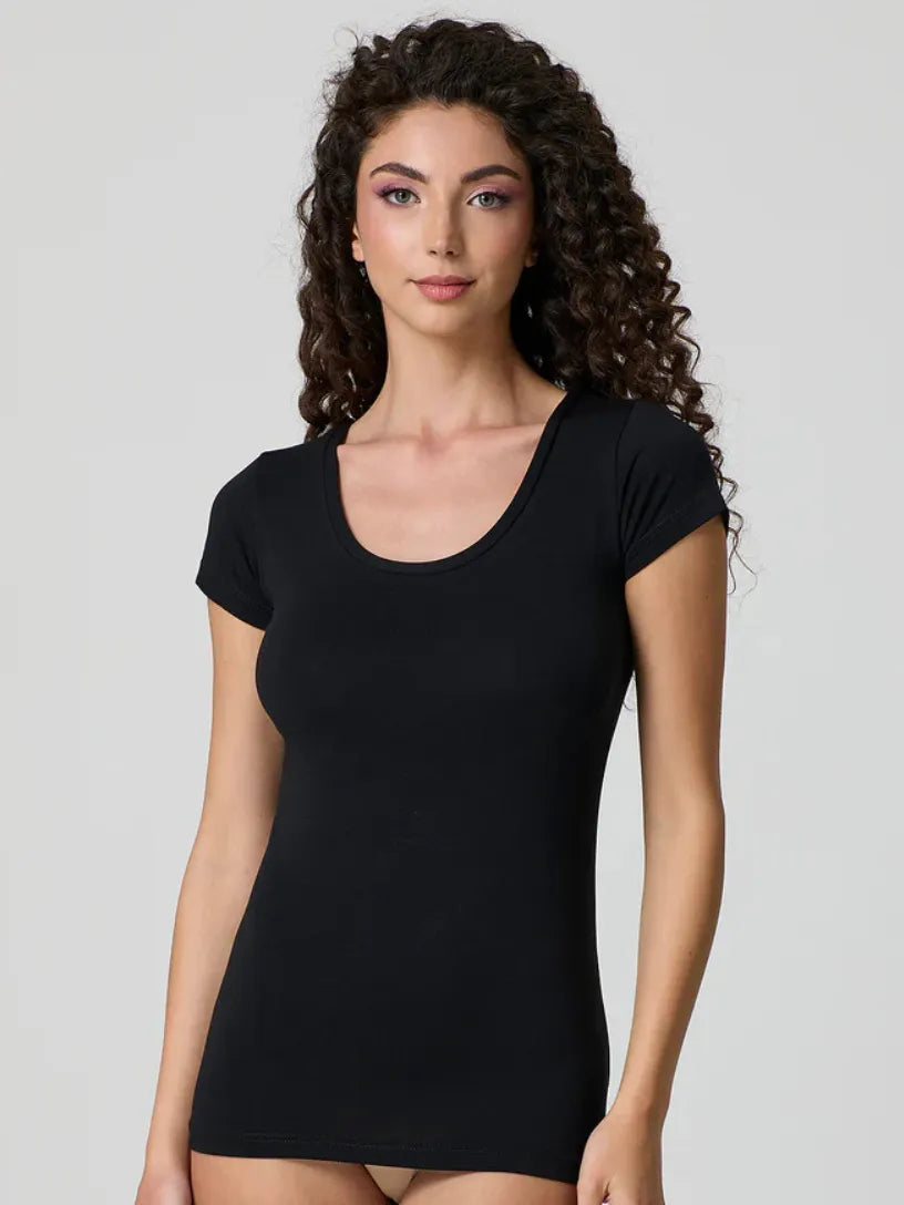 T-shirt con scollo tondo profondo e spalline sottili, realizzata in cotone elastico. Completamente adattabile alle tue forme, perfetta in ogni momento della giornata, comoda e piacevole sulla pelle.