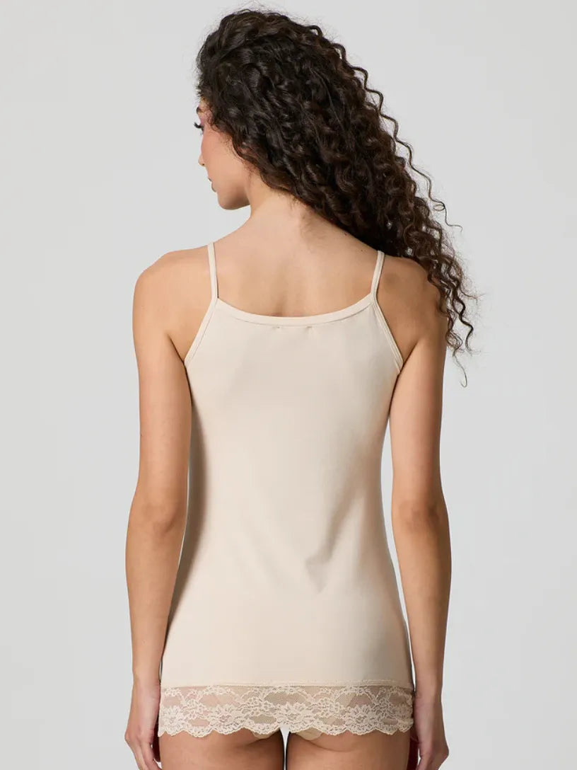 Top in cotone elastico con spalline sottili e un raffinato pizzo smerlato sul fondo della maglia. Ideale come sottogiacca.